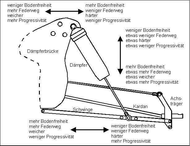 für das Federbein verschiedene Befestigungspunkte an der Schwinge